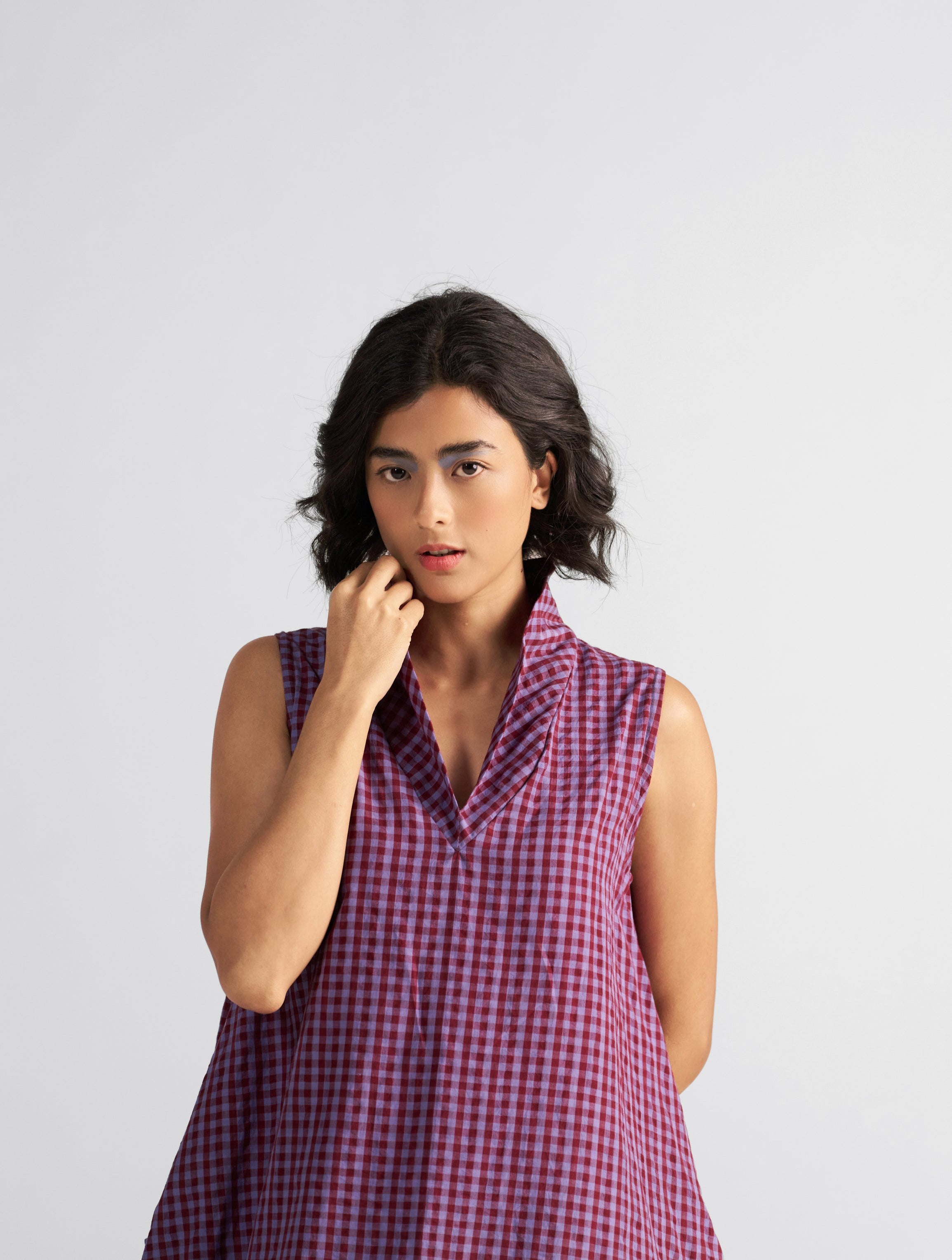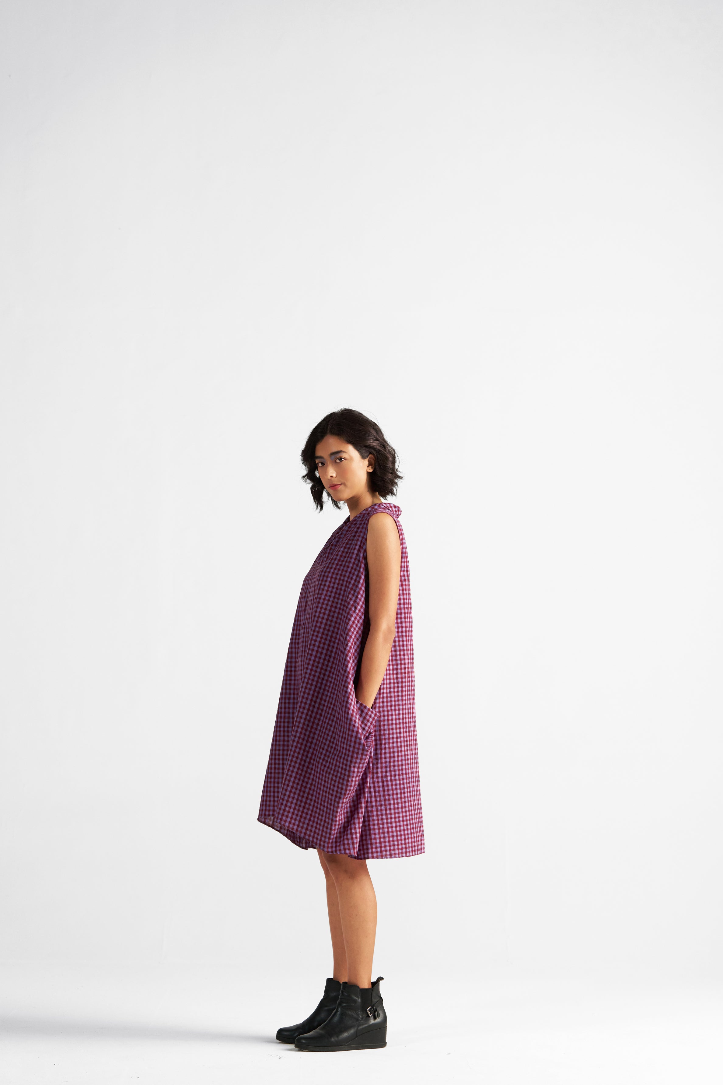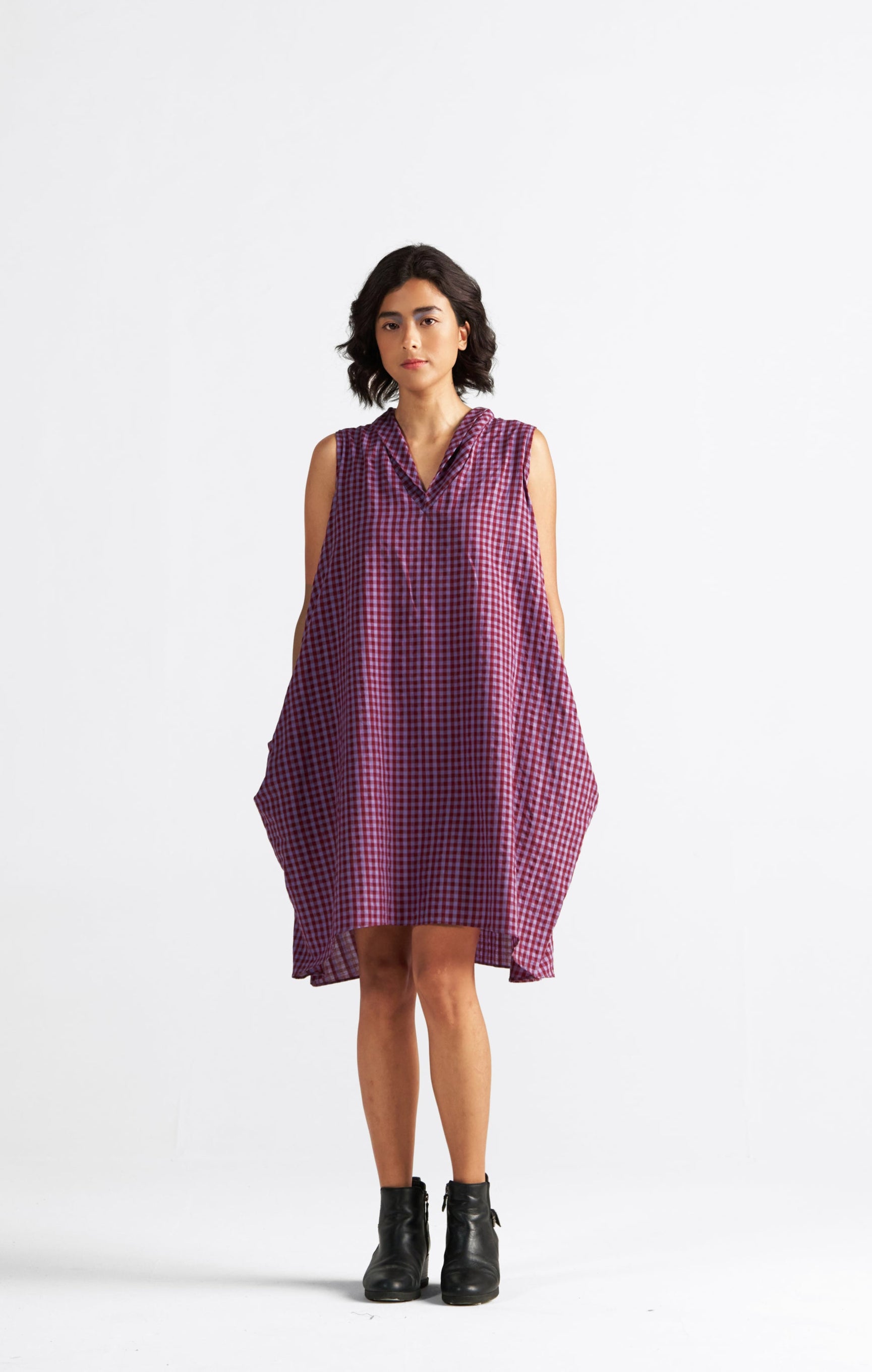 A dress that feels like a twirl in a sunlit corridor. Gaul is short, swingy, and softly structured — designed to move with you, not against you. The pleated cowl neckline adds an old-school charm, while the roomy silhouette makes it playful, free, and undeniably flattering.