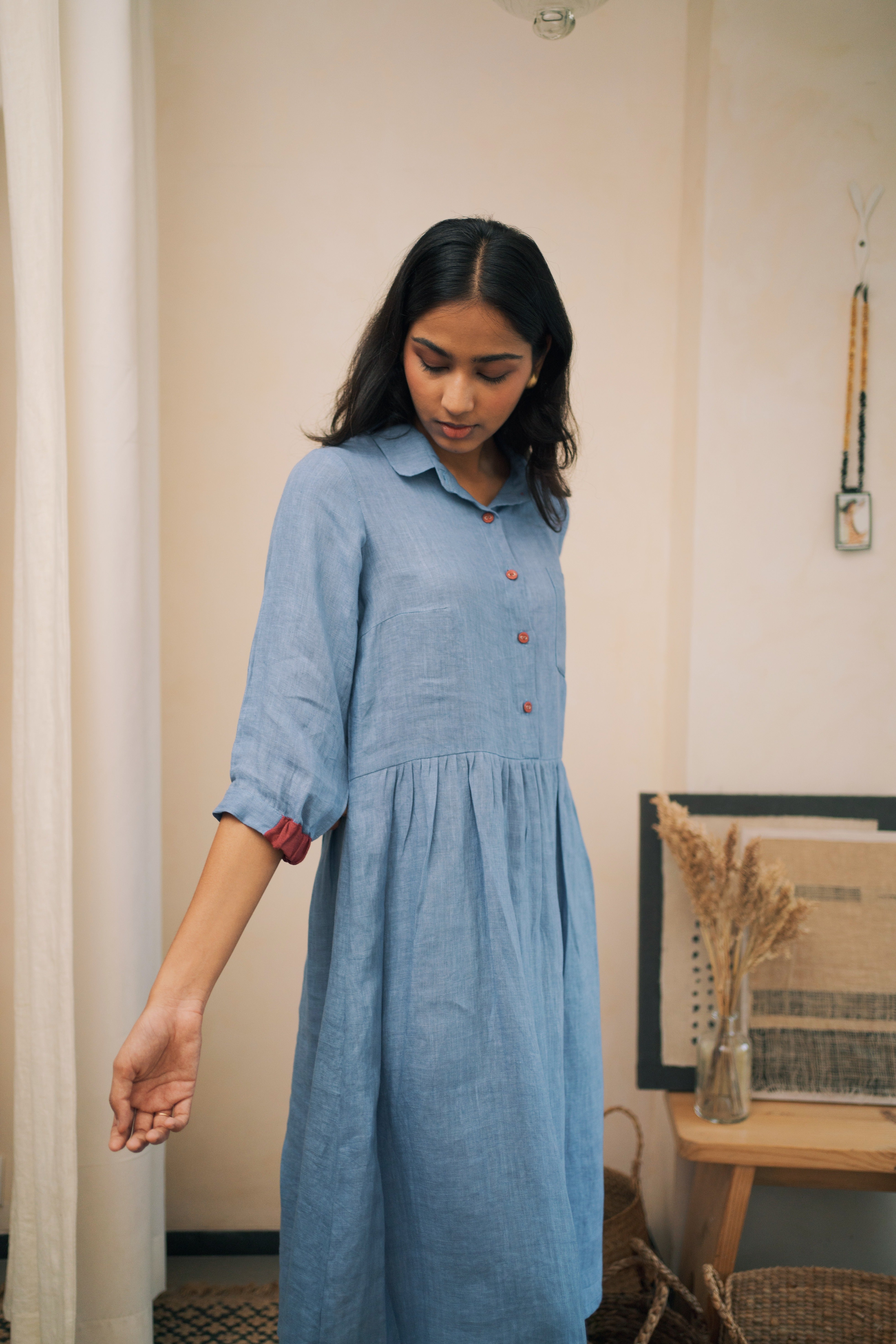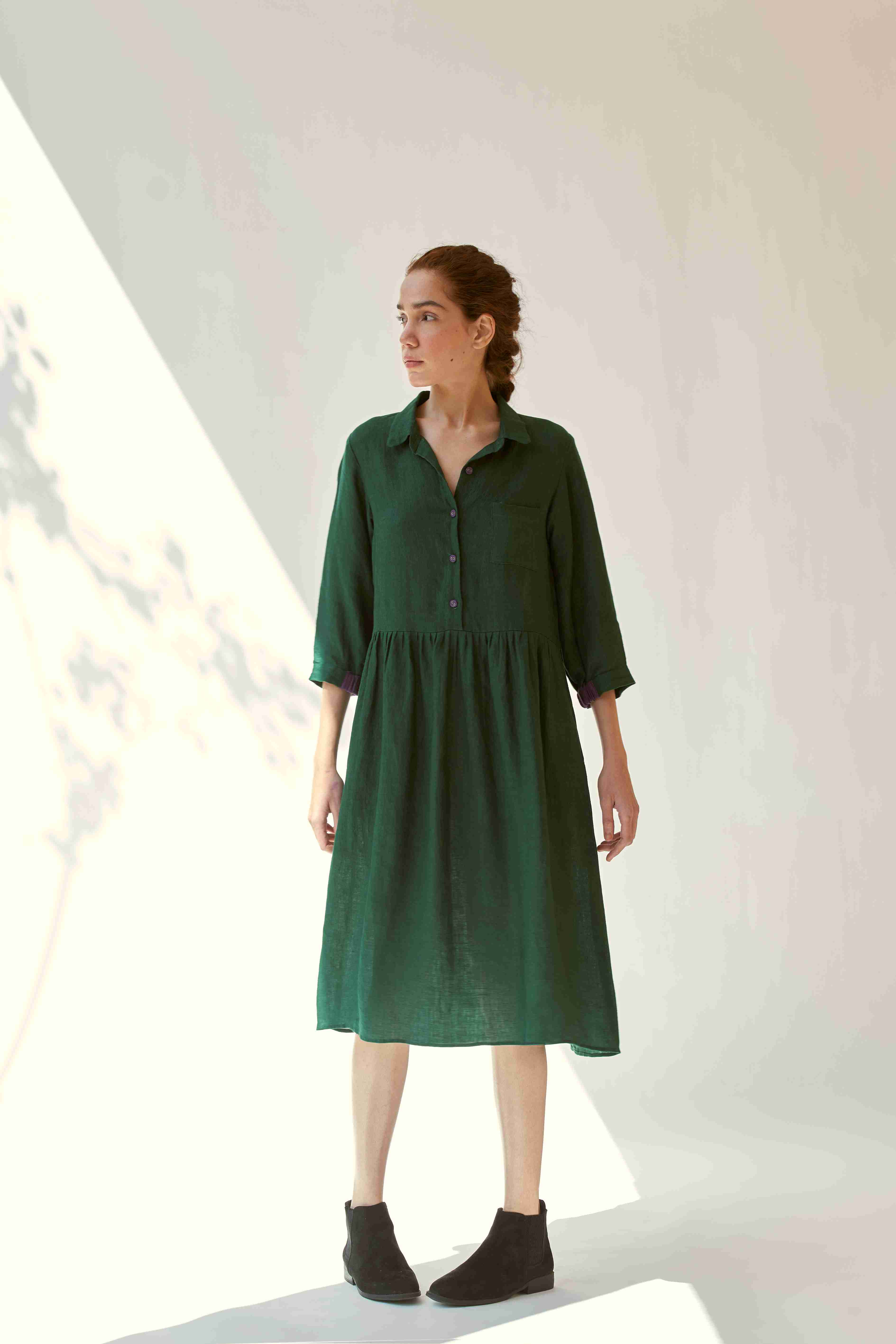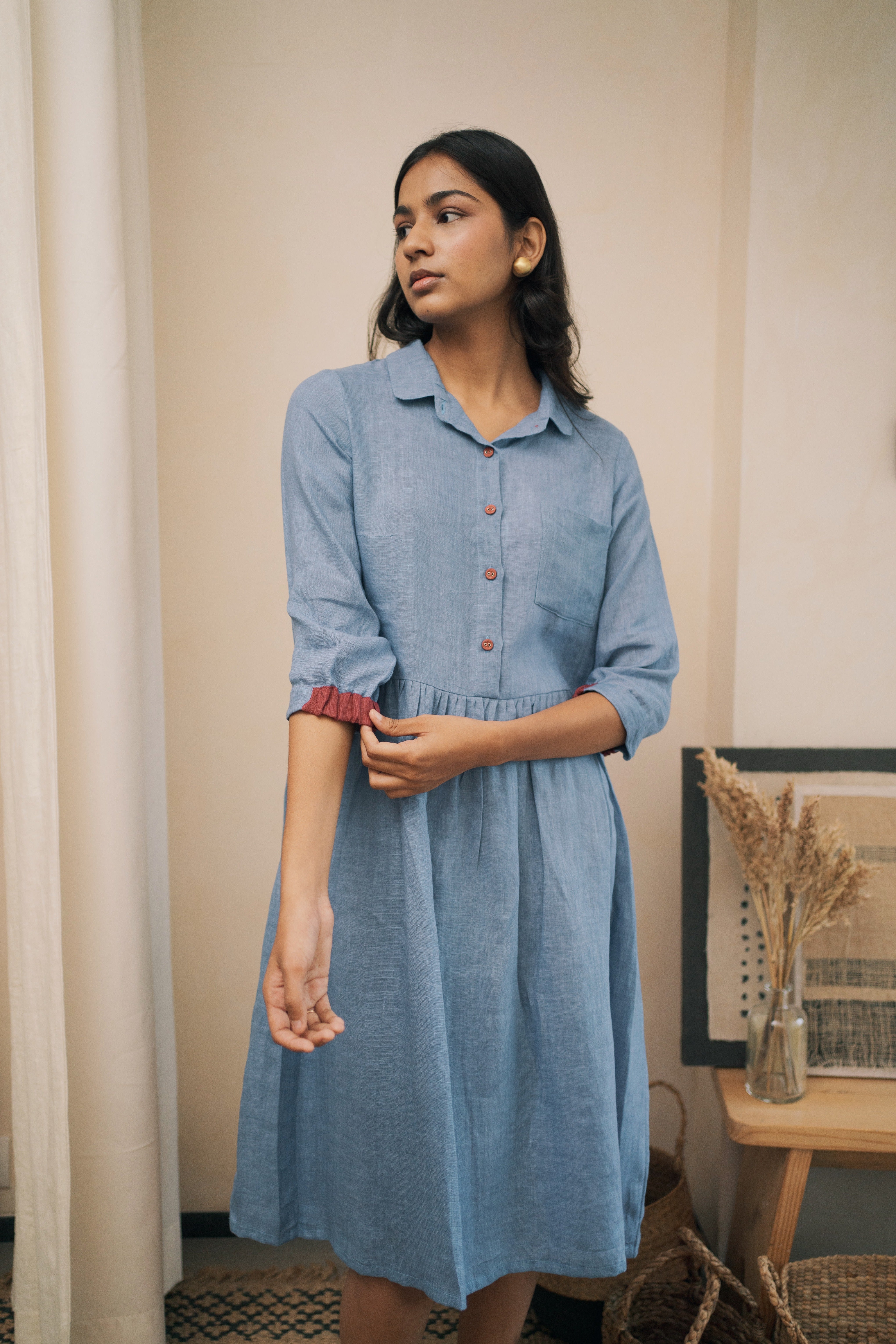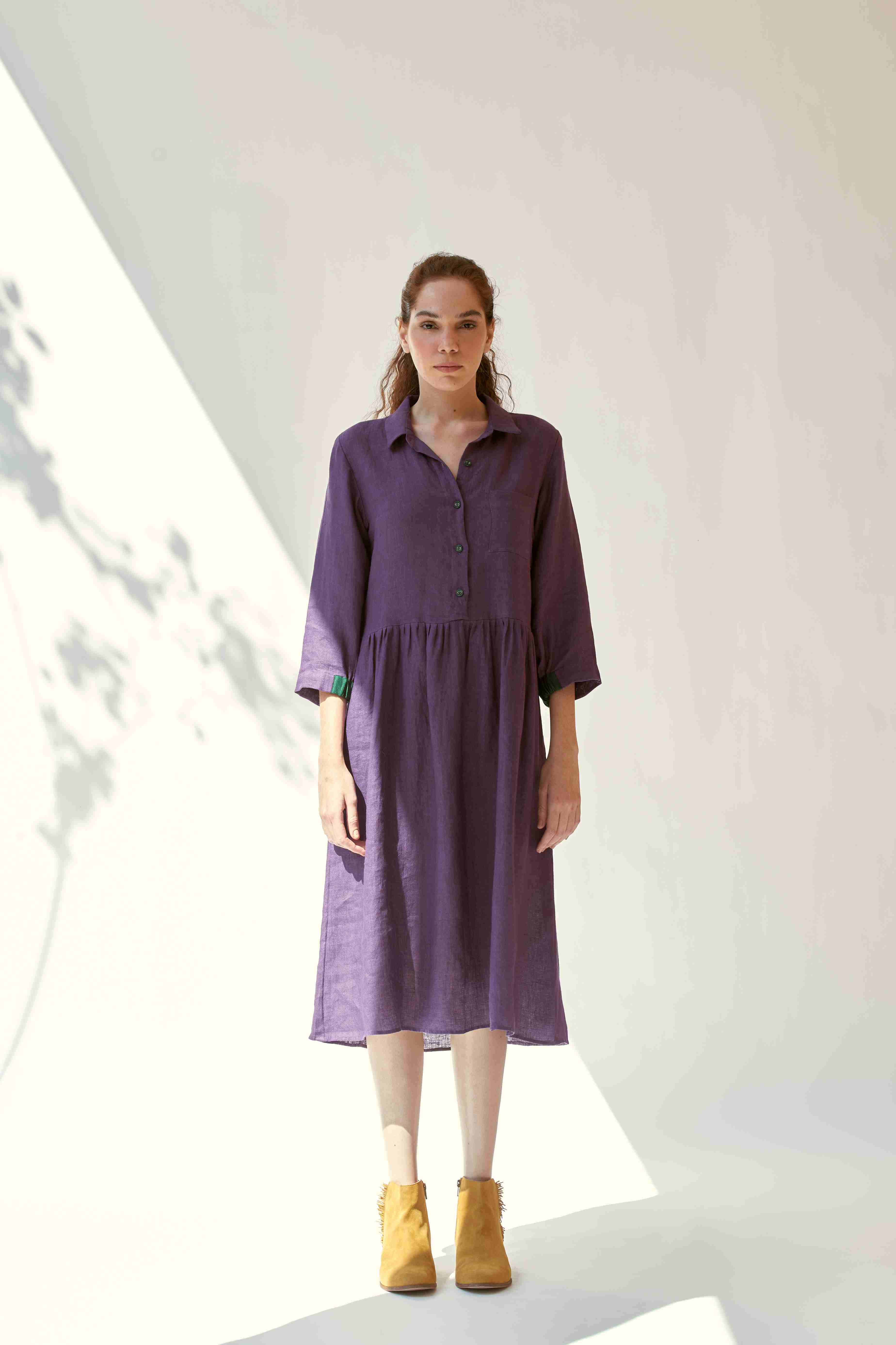 ‘In the moment’ is designed to flatter every figure with grace and style with a classic shirt collar and gathered waist. Hint of contrast color on the linen buttons and cuffs of the sleeve adds to its allure.