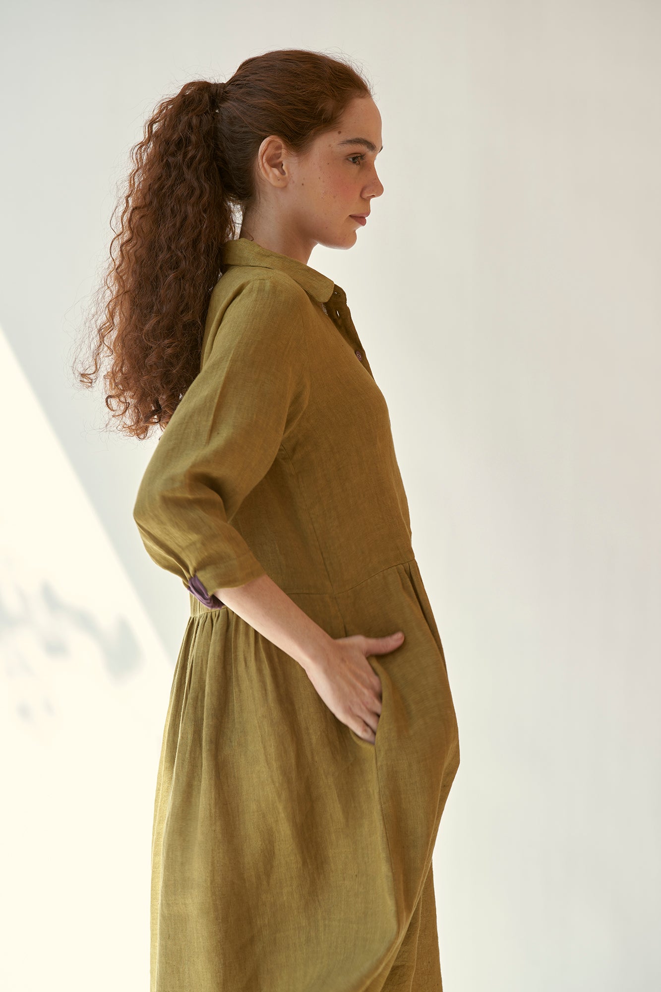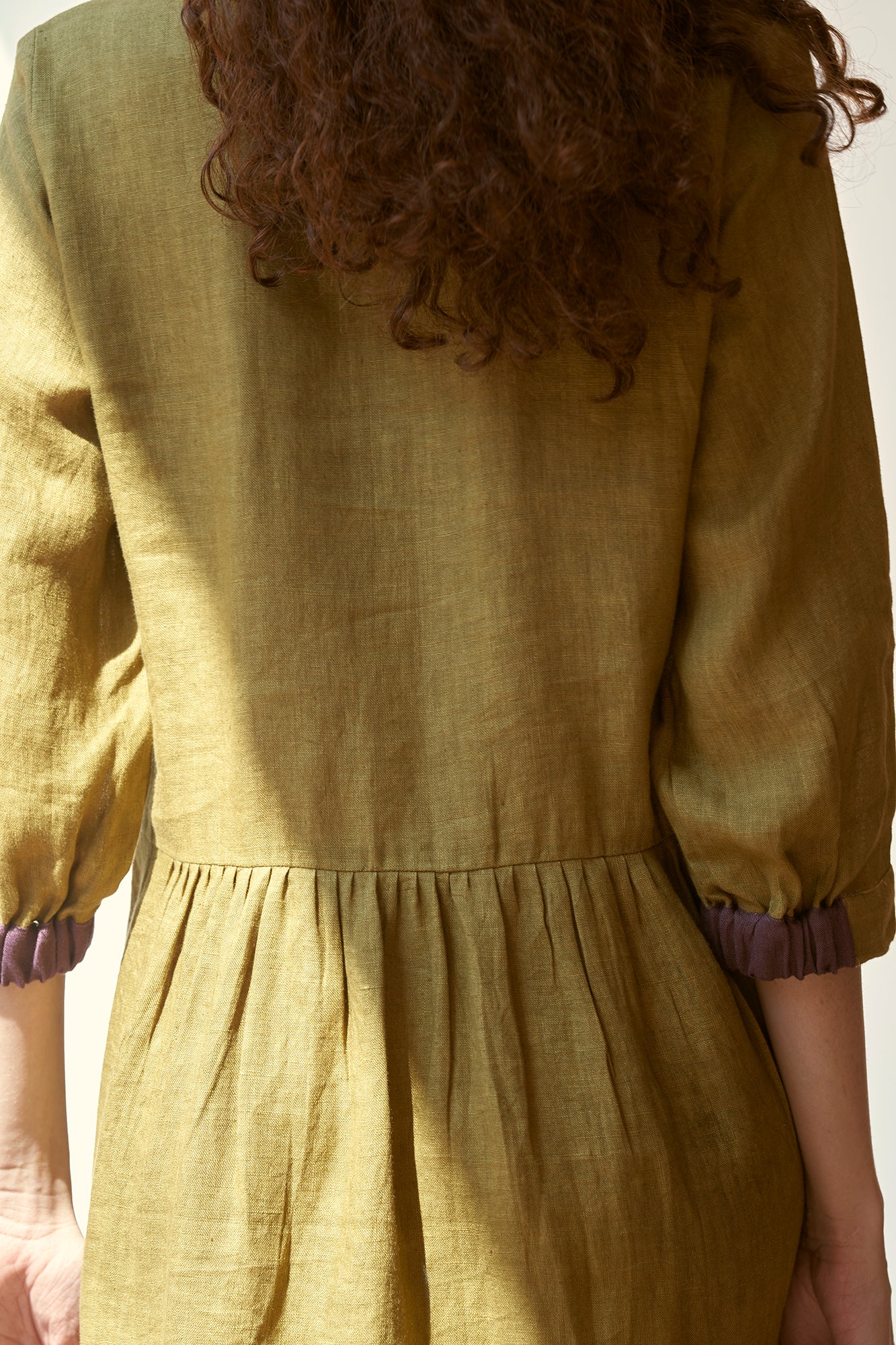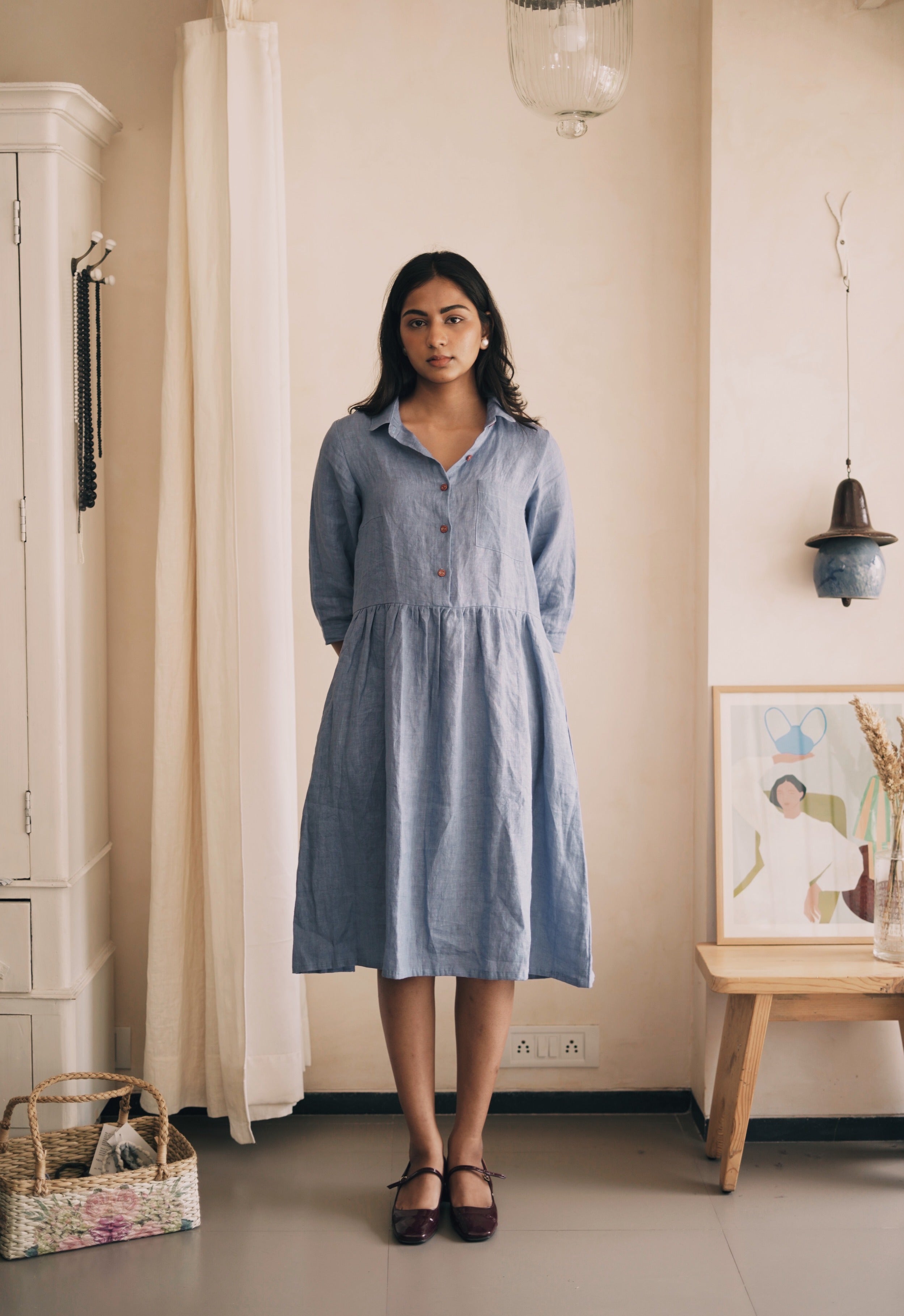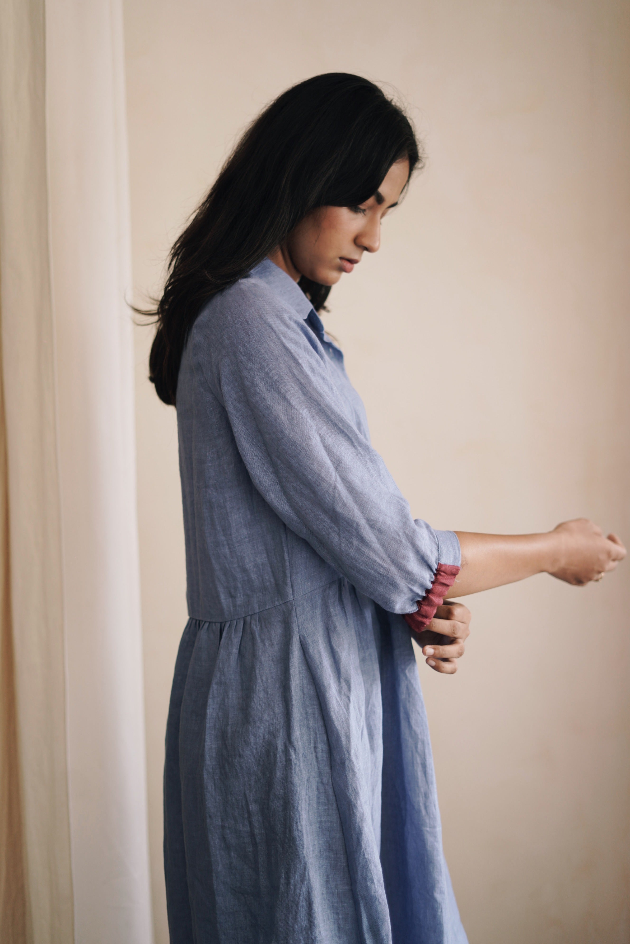 ‘In the moment’ is designed to flatter every figure with grace and style with a classic shirt collar and gathered waist. Hint of contrast color on the linen buttons and cuffs of the sleeve adds to its allure.