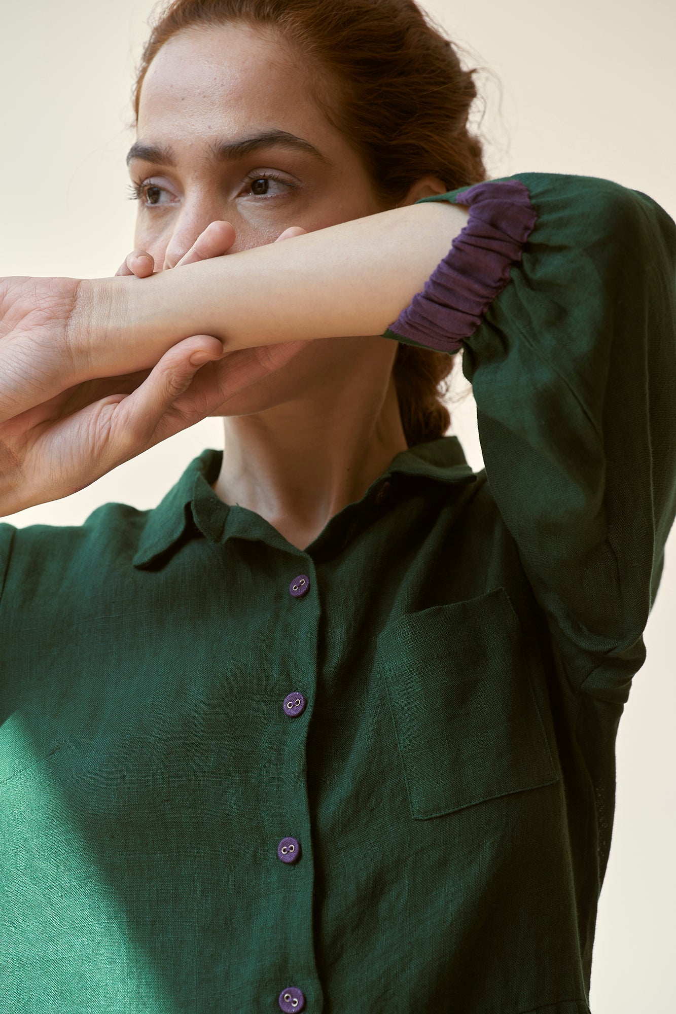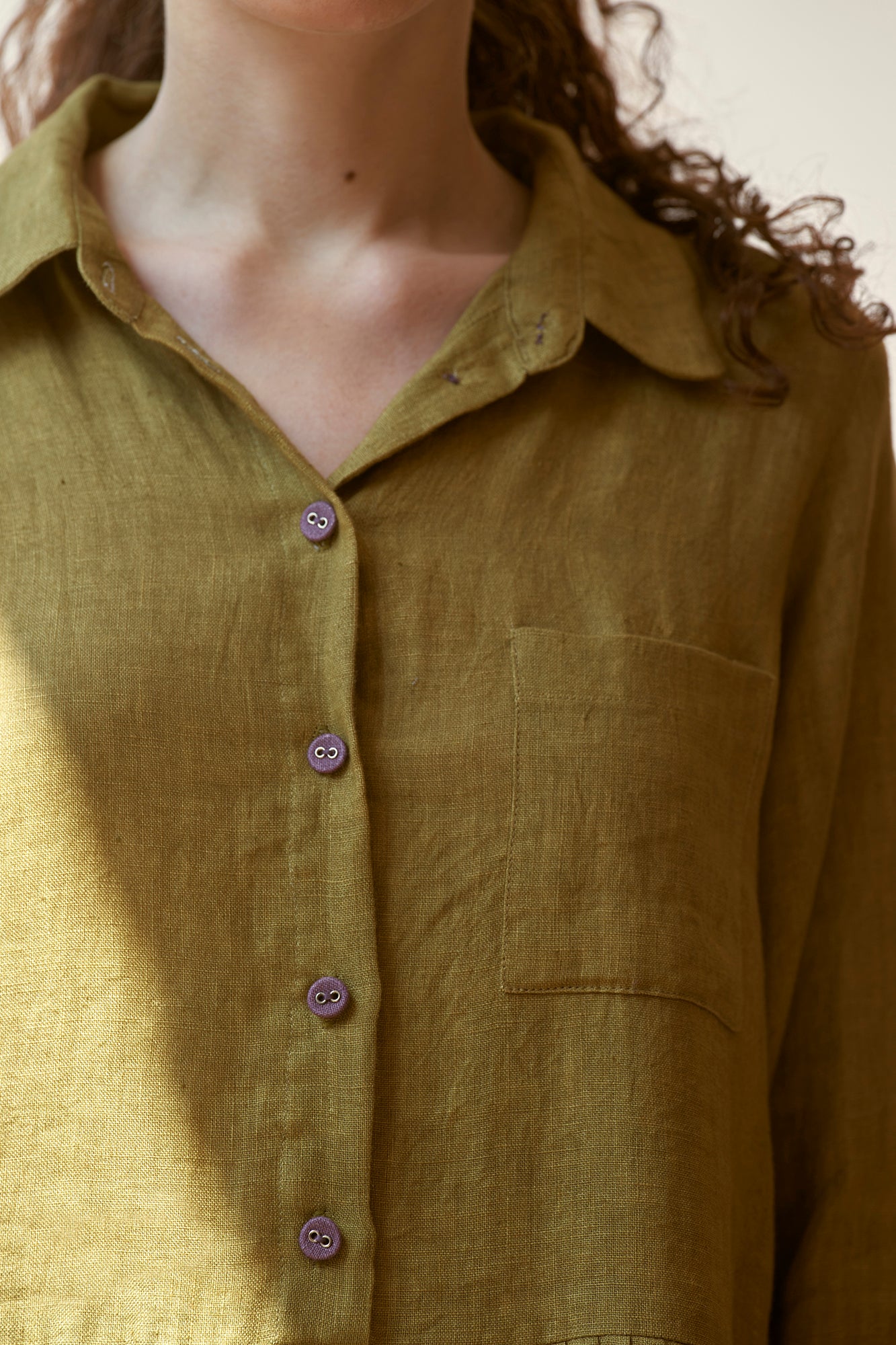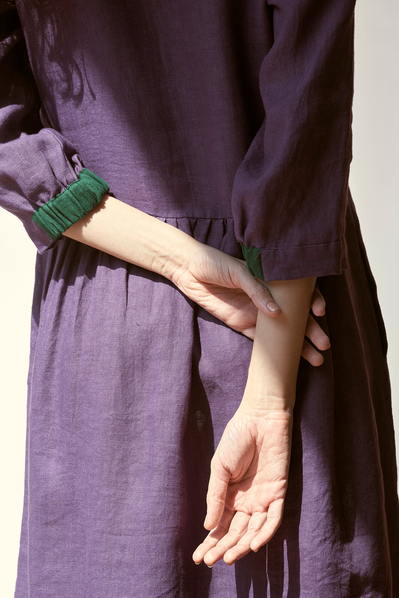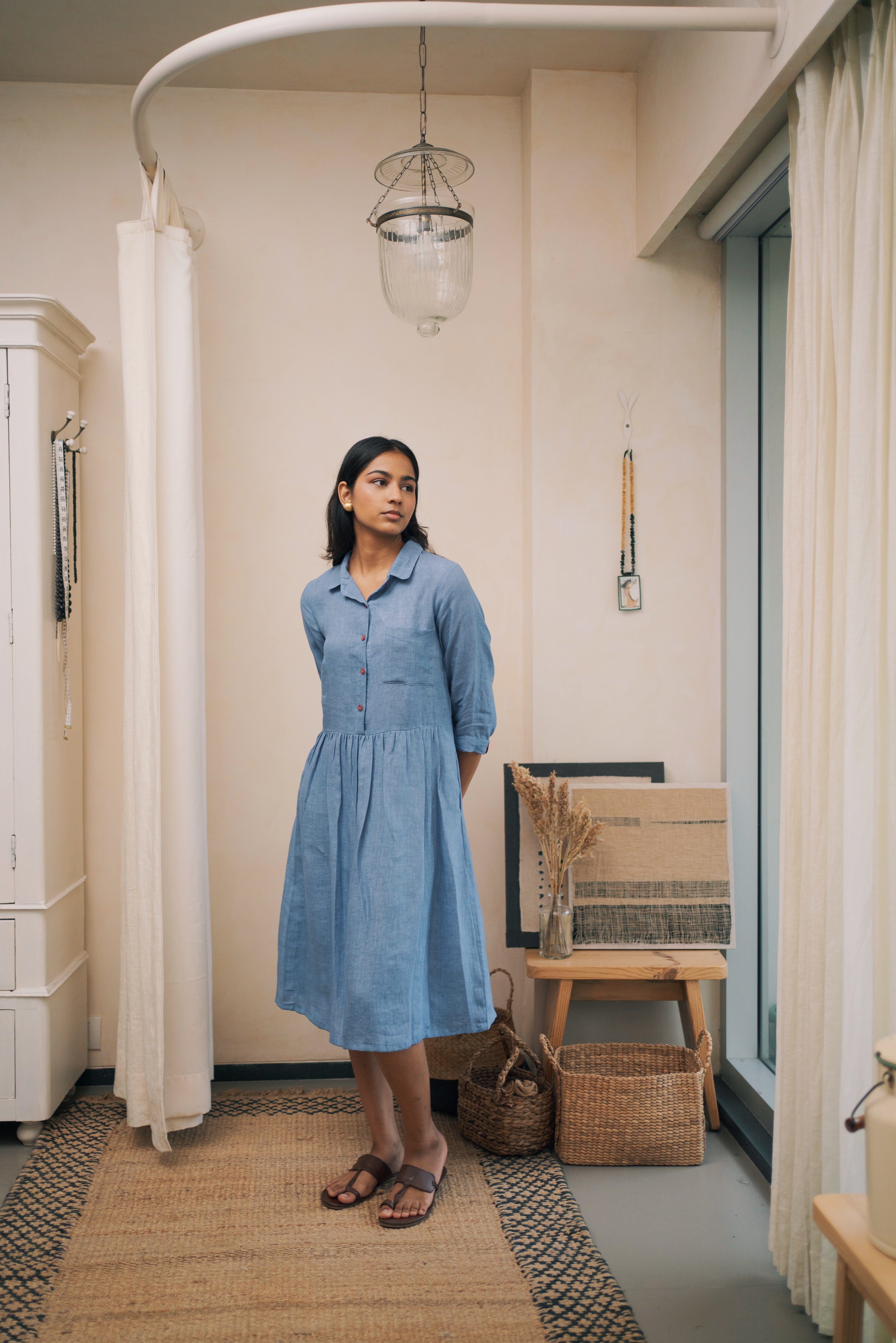 ‘In the moment’ is designed to flatter every figure with grace and style with a classic shirt collar and gathered waist. Hint of contrast color on the linen buttons and cuffs of the sleeve adds to its allure.