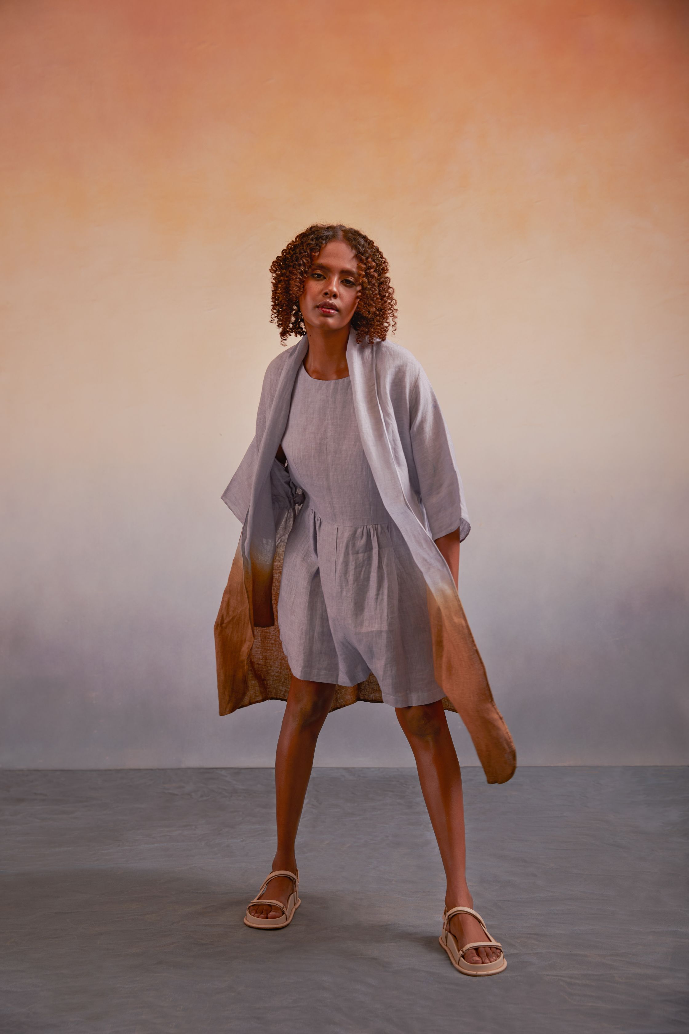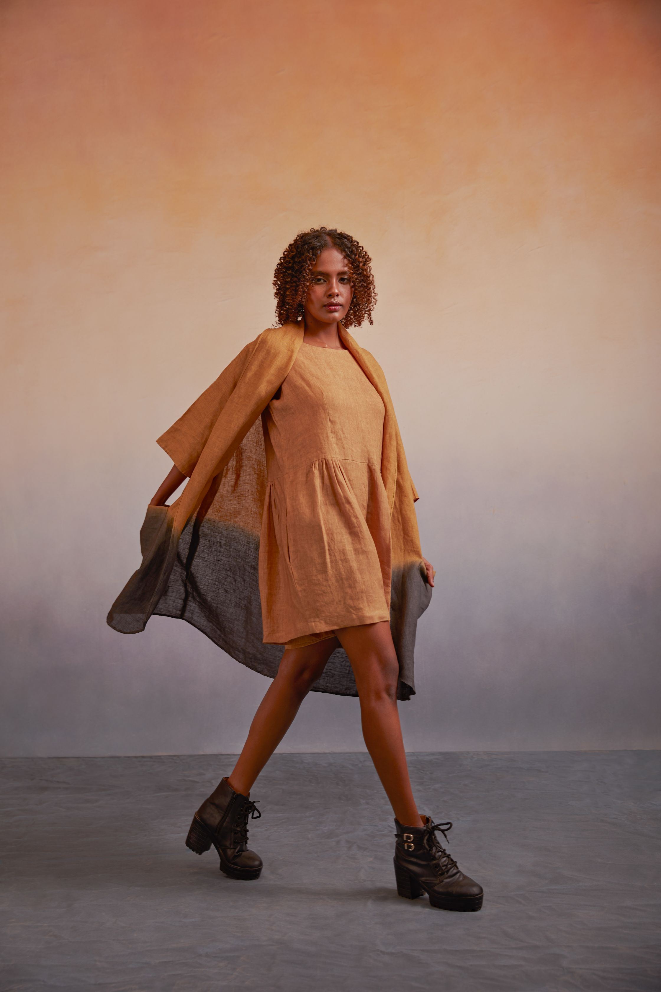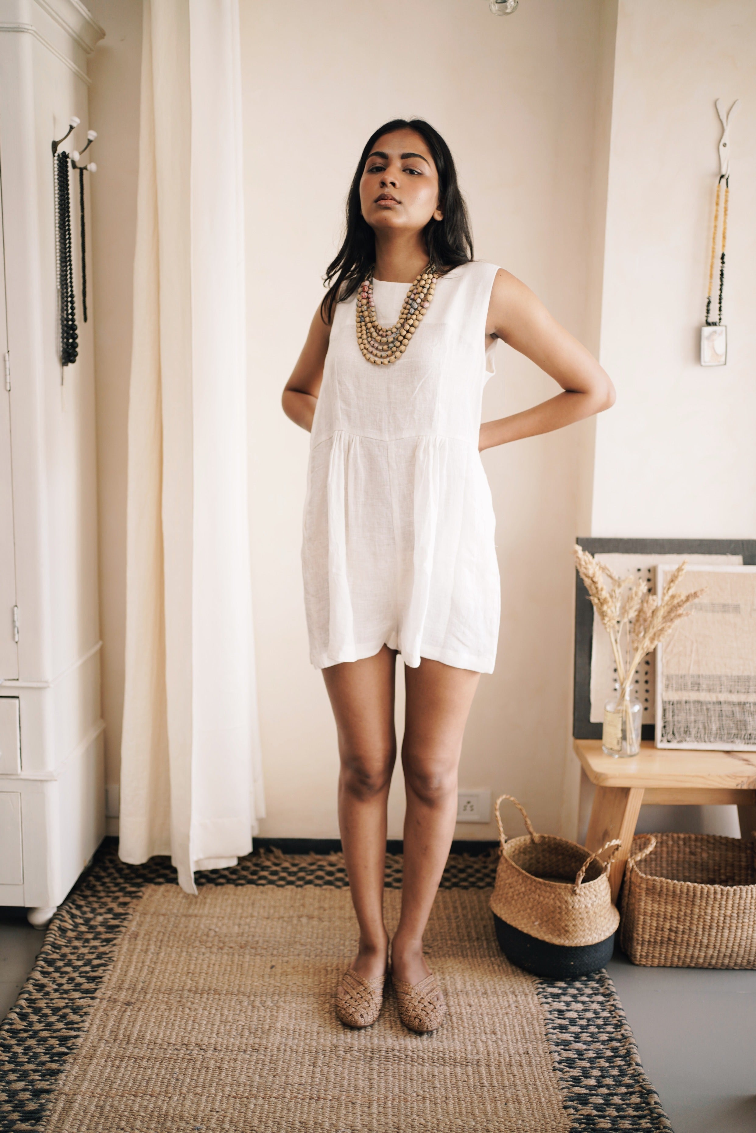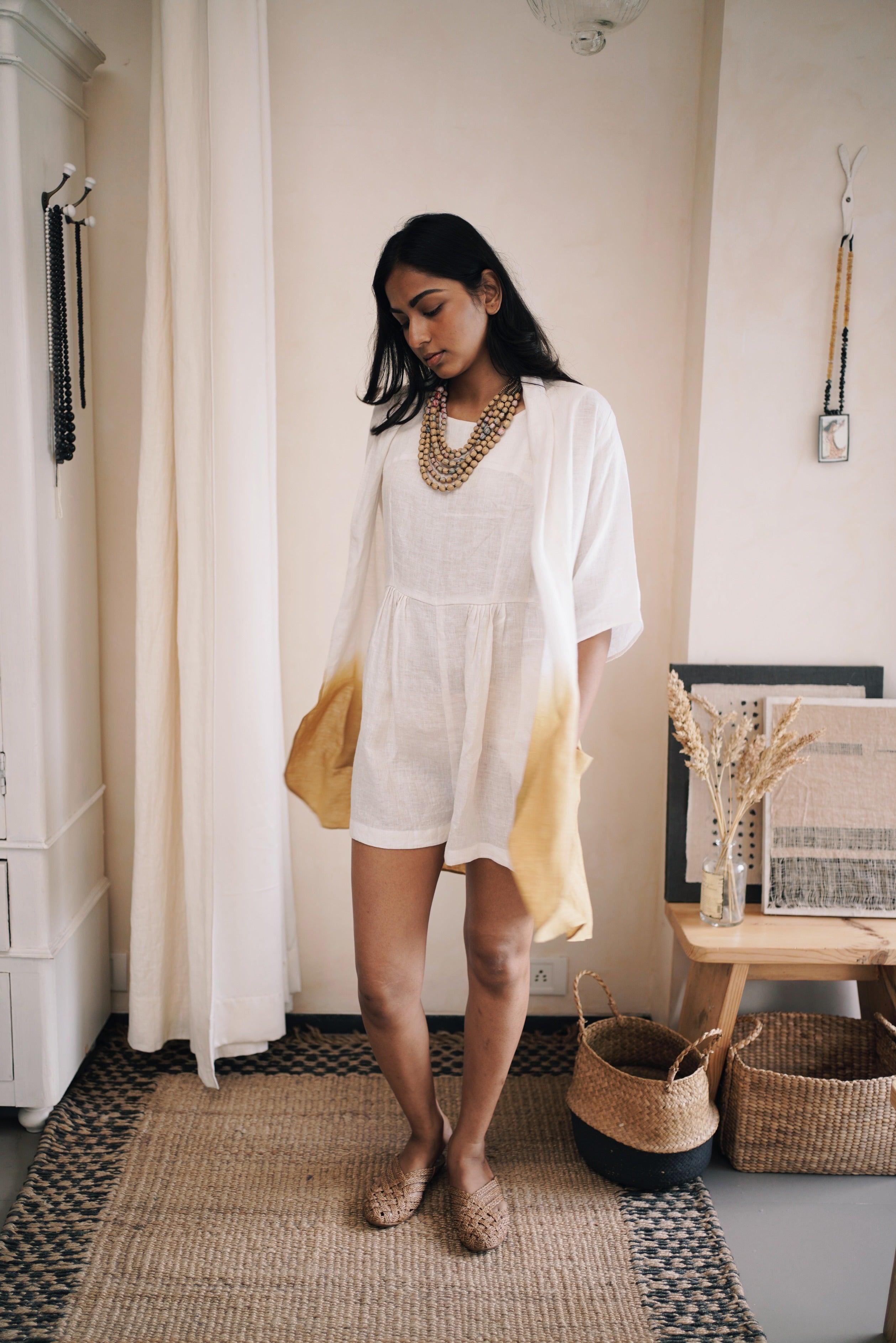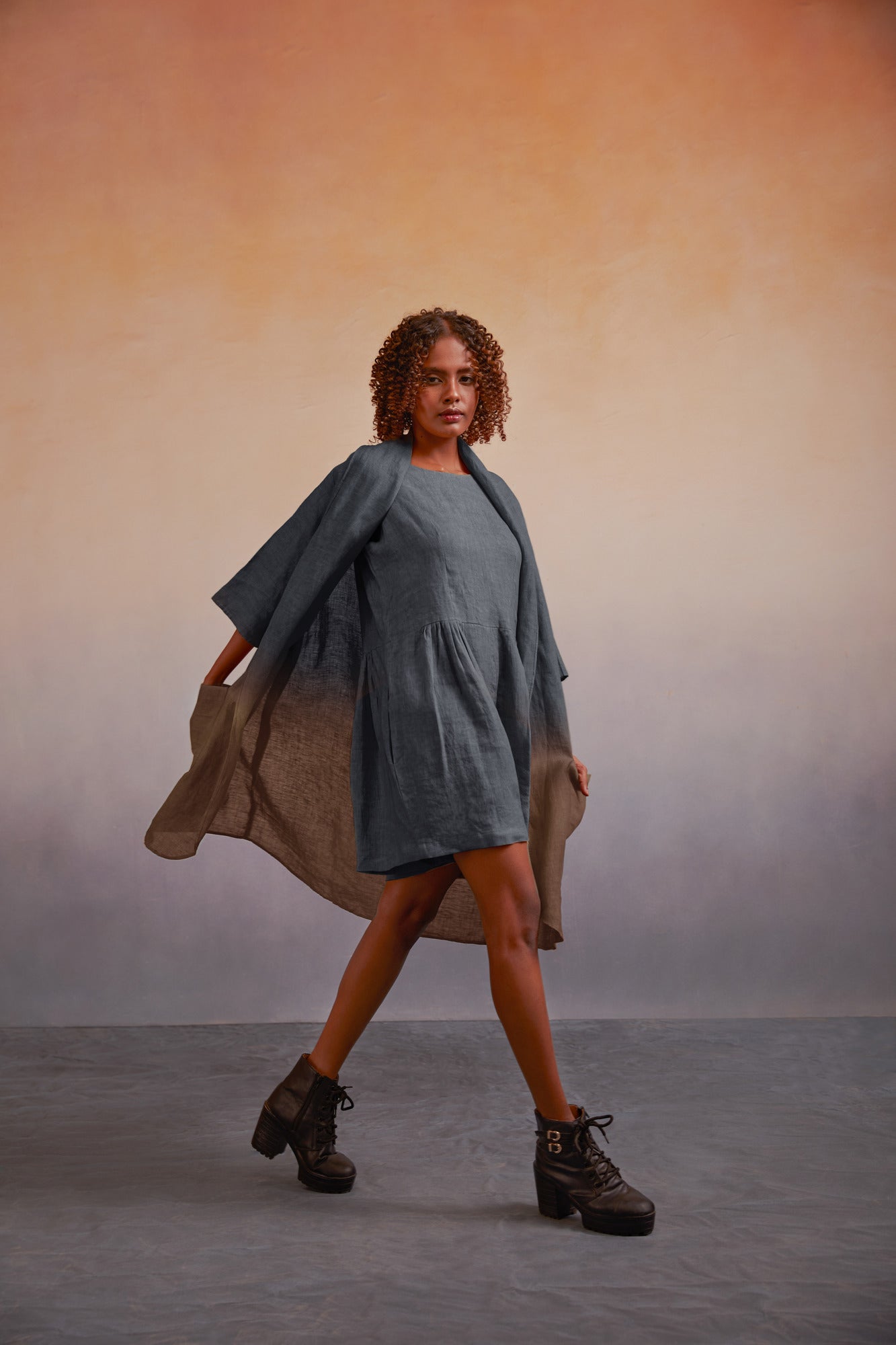 An outfit which gives freedom and playfulness as well as a style statement. A short length with wide legs boy jumpsuit which brings comfort and a long jacket accompanies to add a statement that makes the entire two-piece outfit as a formal evening wear.