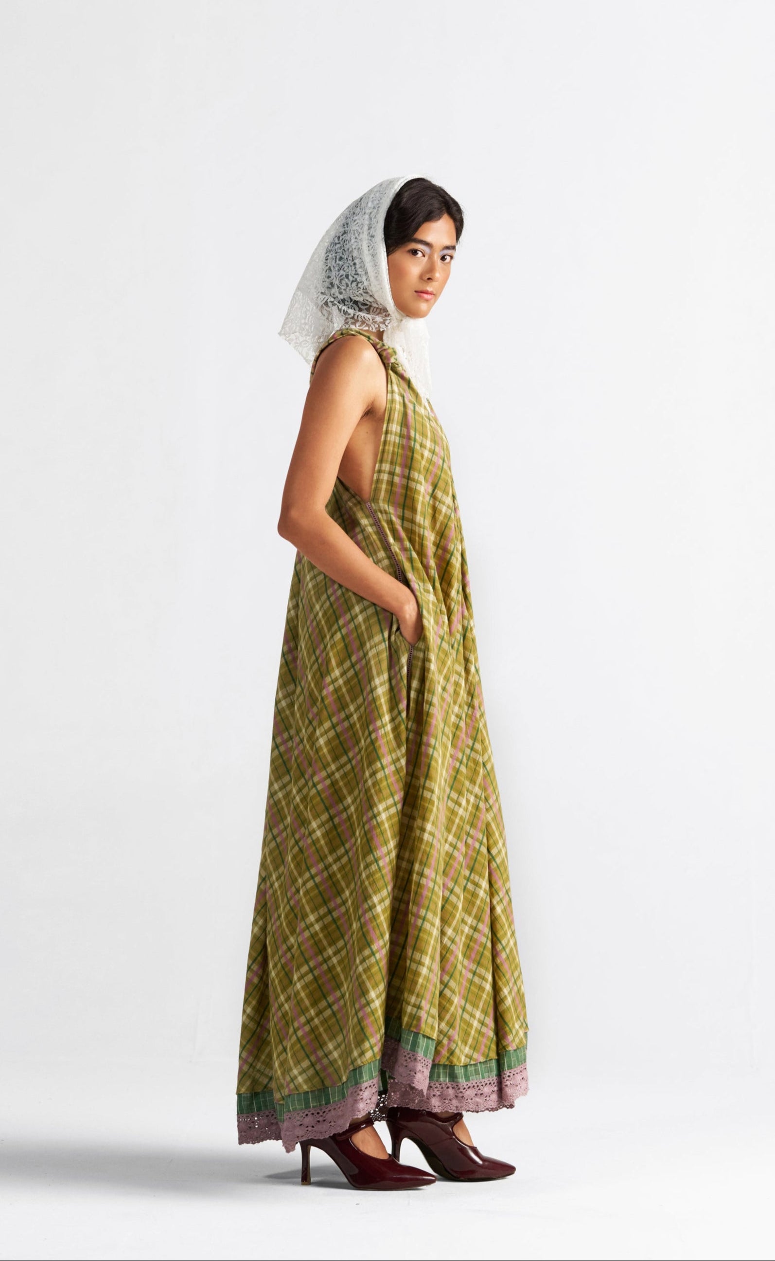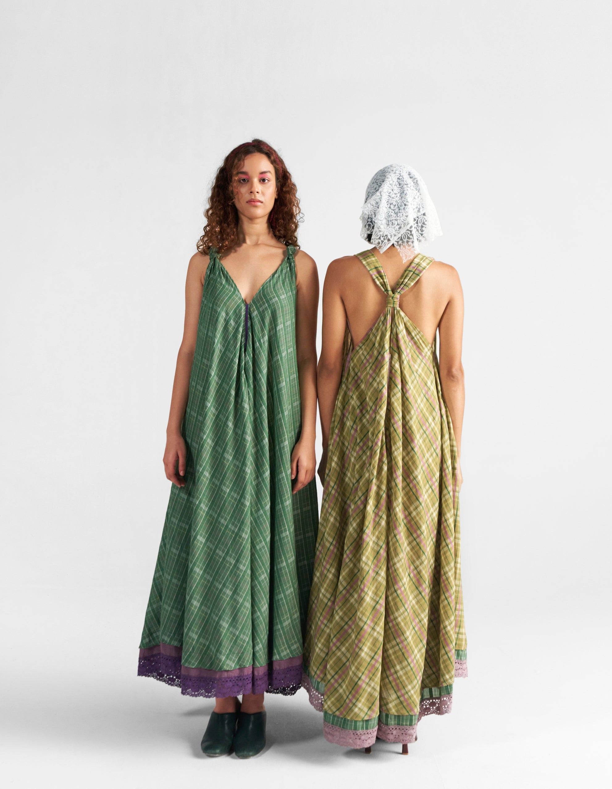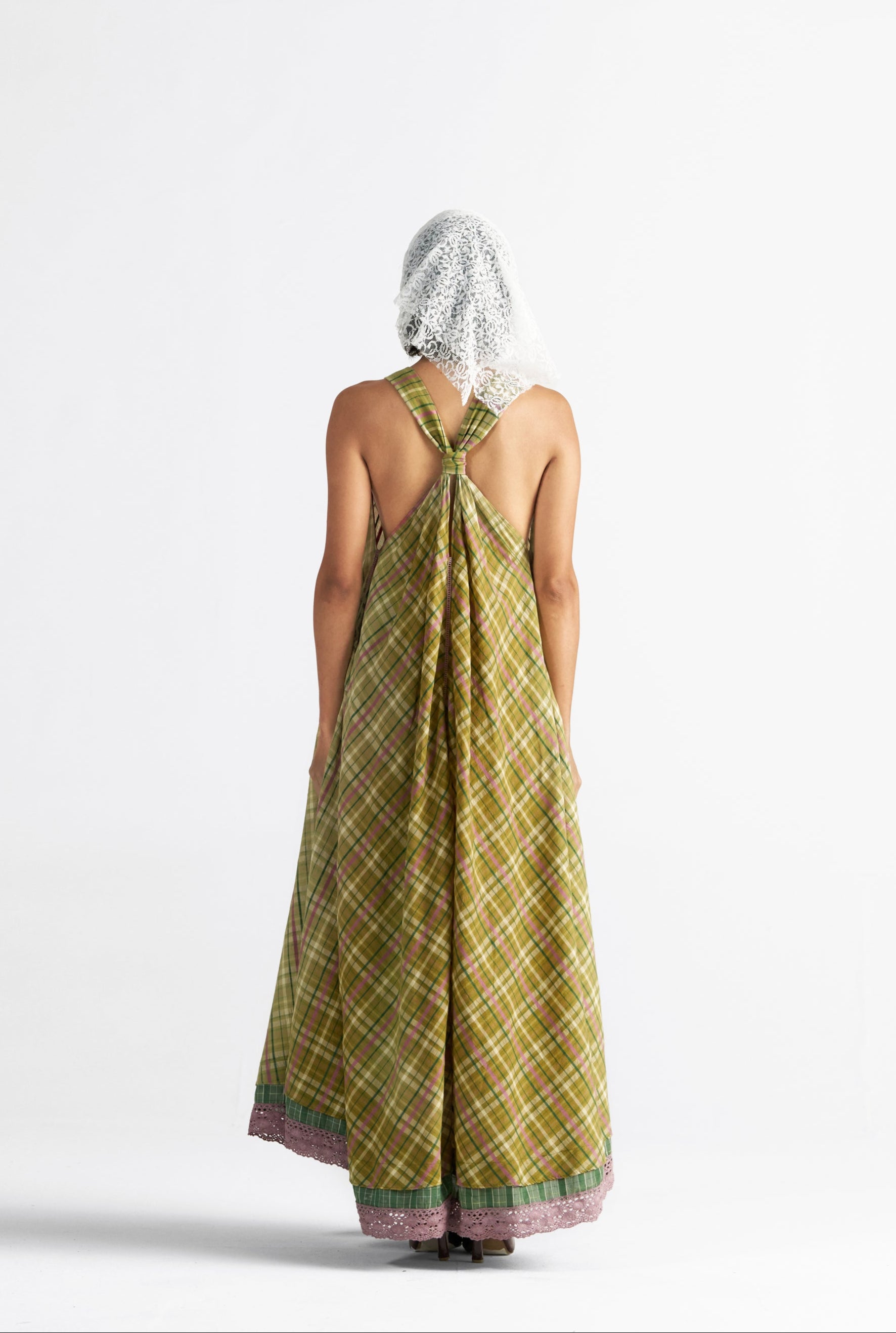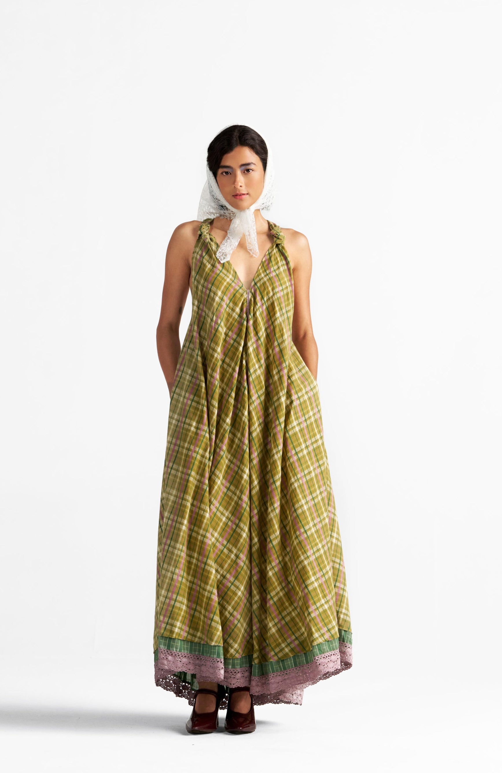 Handwoven in breathable cotton checks and cut on the bias, this backless summer dress flows with you. It features a soft knot at the neckline, cross-back straps, practical pockets, and delicate lace detailing at the hem. Madeline is your go-to for sunlit afternoons, slow gatherings, or just feeling beautifully yourself.
