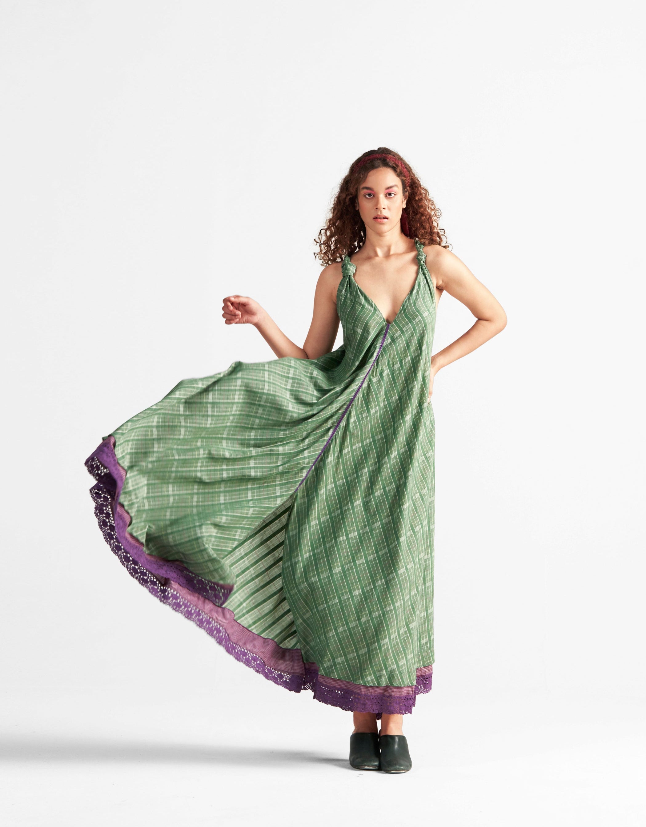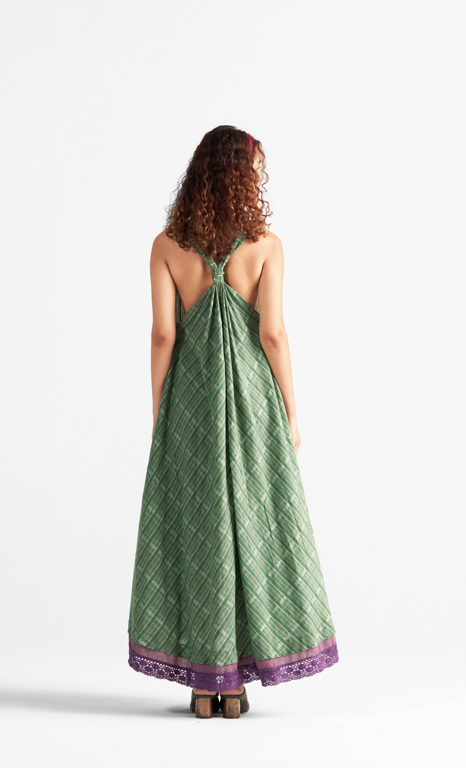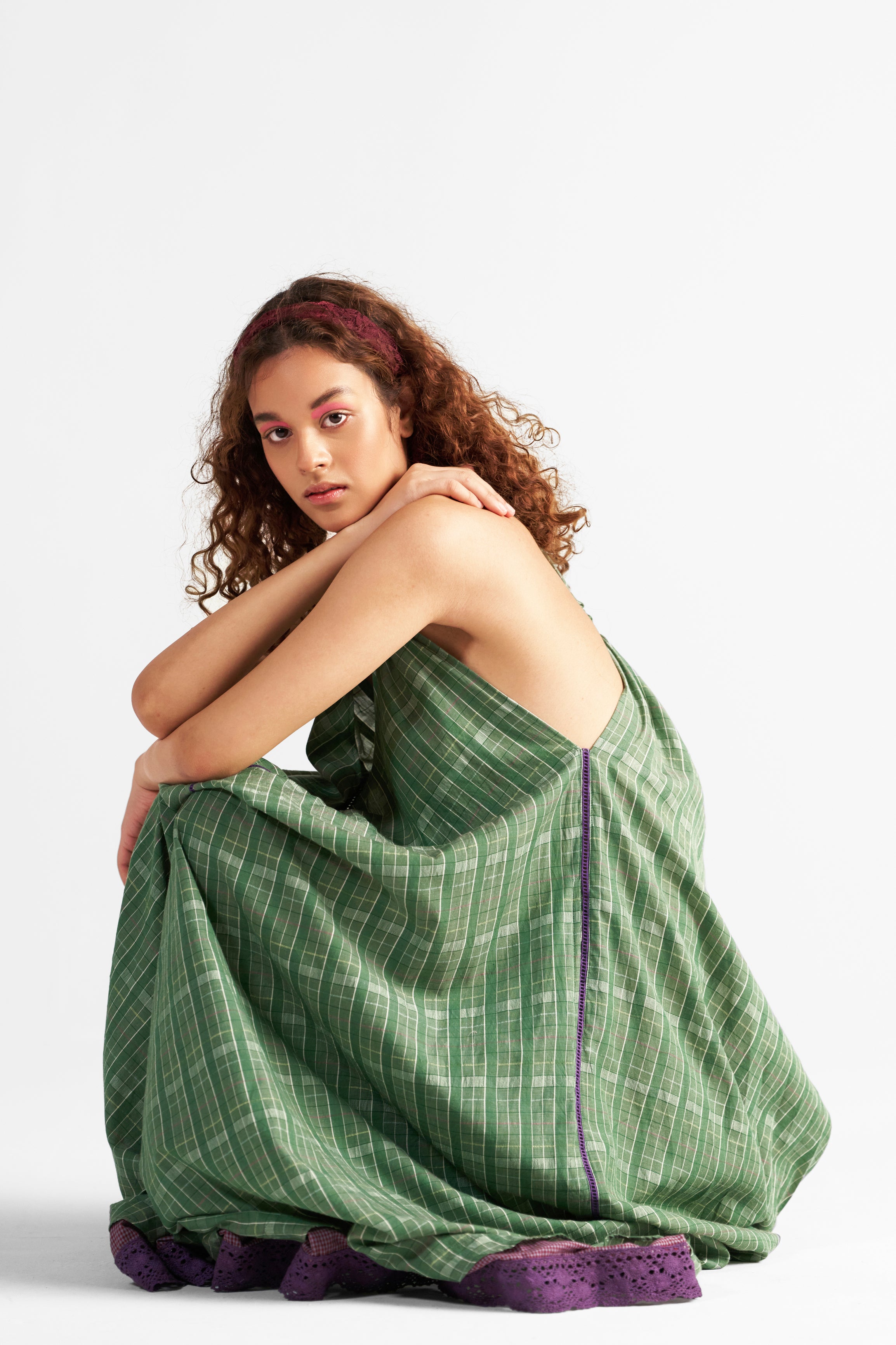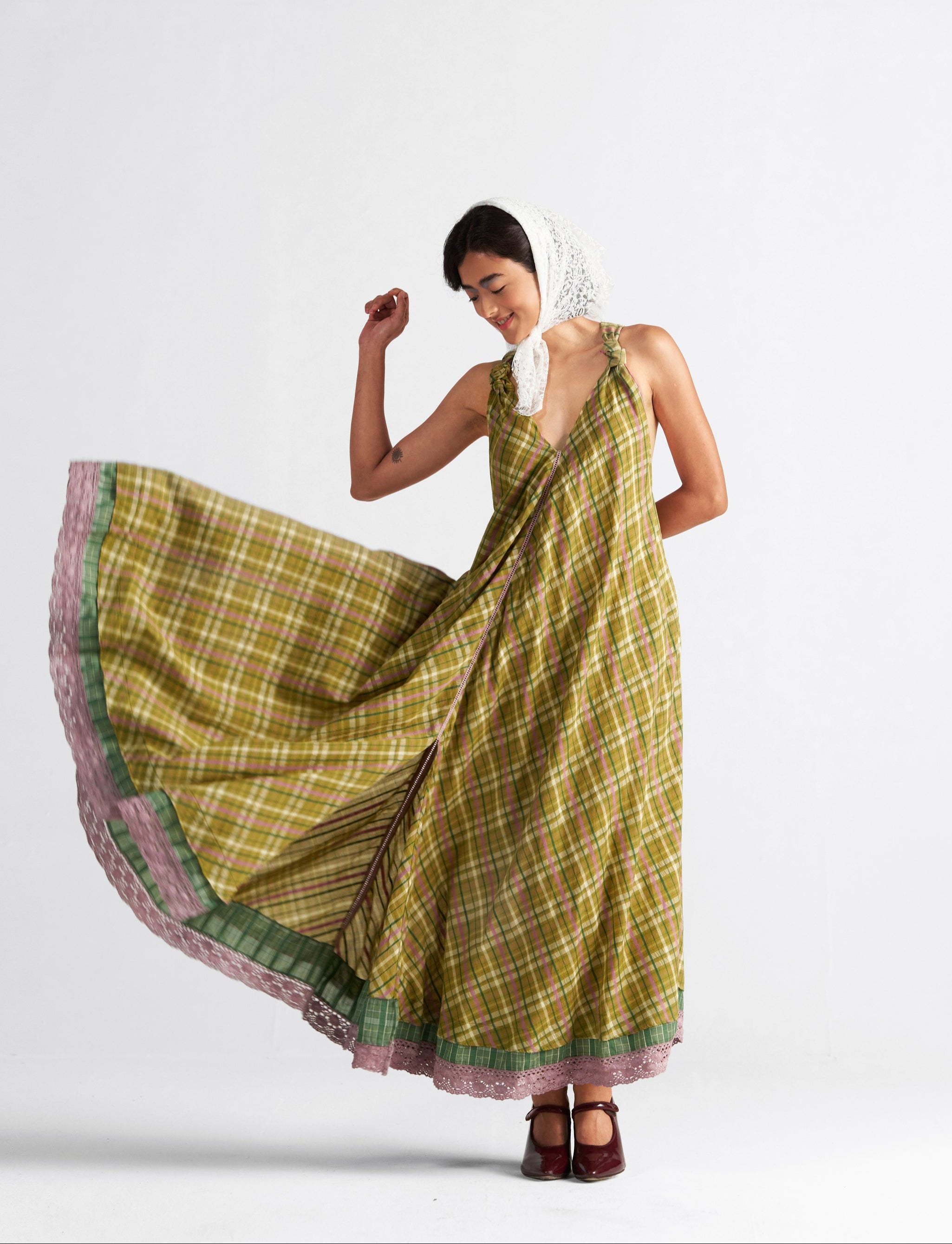 Handwoven in breathable cotton checks and cut on the bias, this backless summer dress flows with you. It features a soft knot at the neckline, cross-back straps, practical pockets, and delicate lace detailing at the hem. Madeline is your go-to for sunlit afternoons, slow gatherings, or just feeling beautifully yourself.