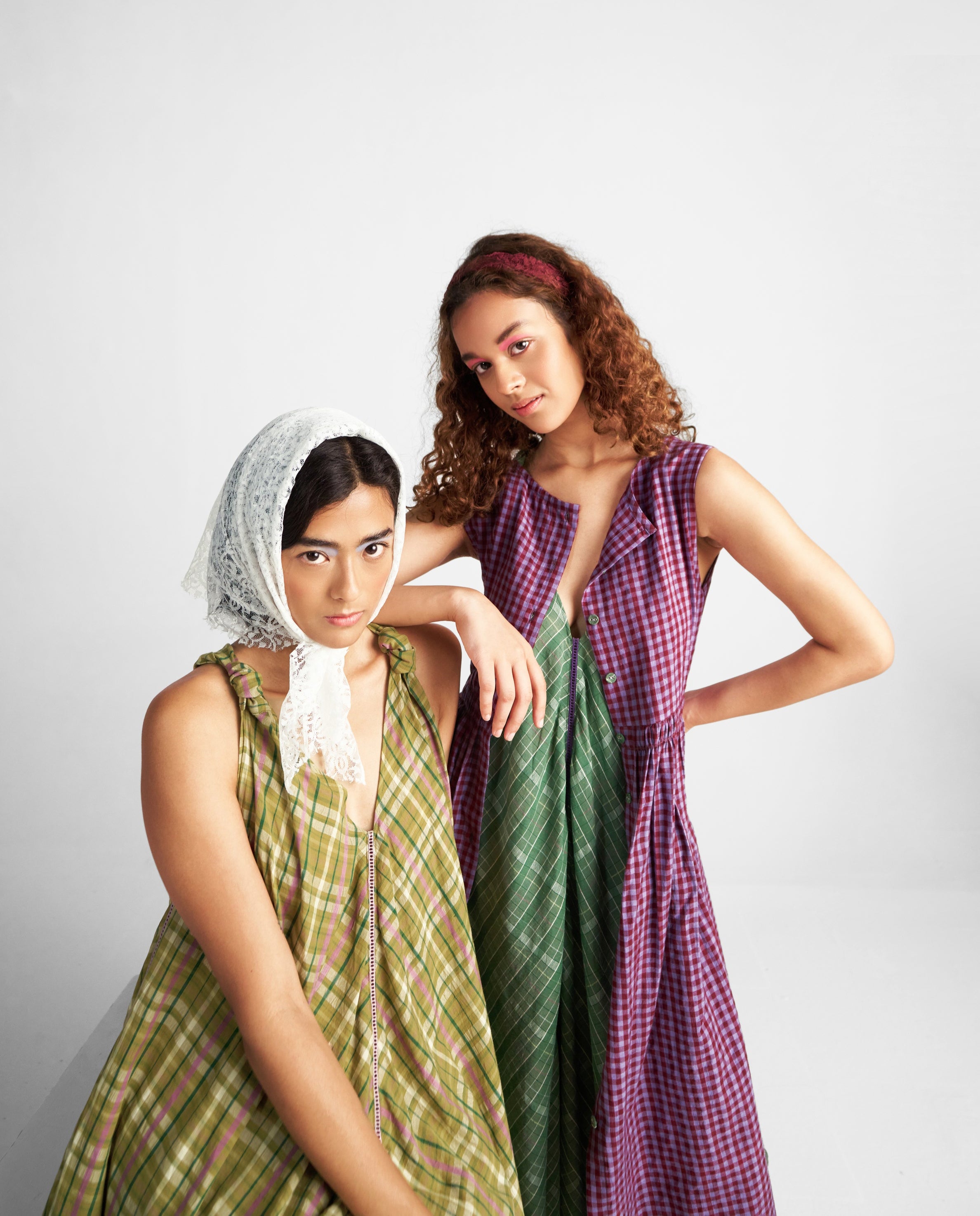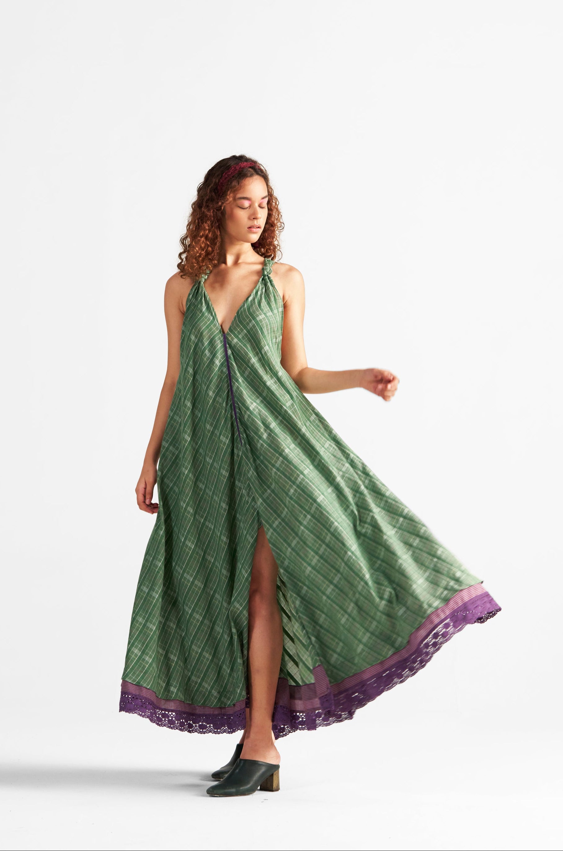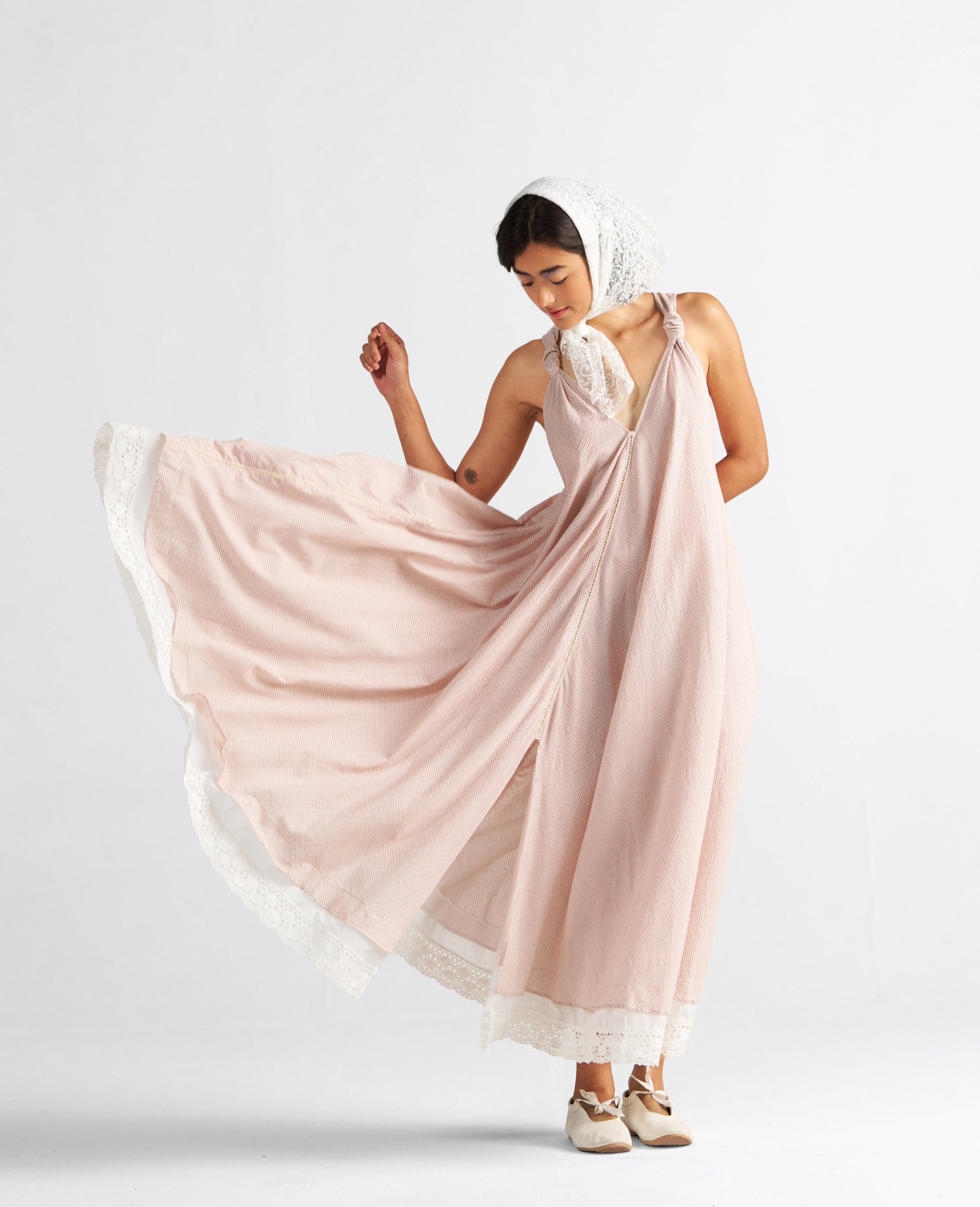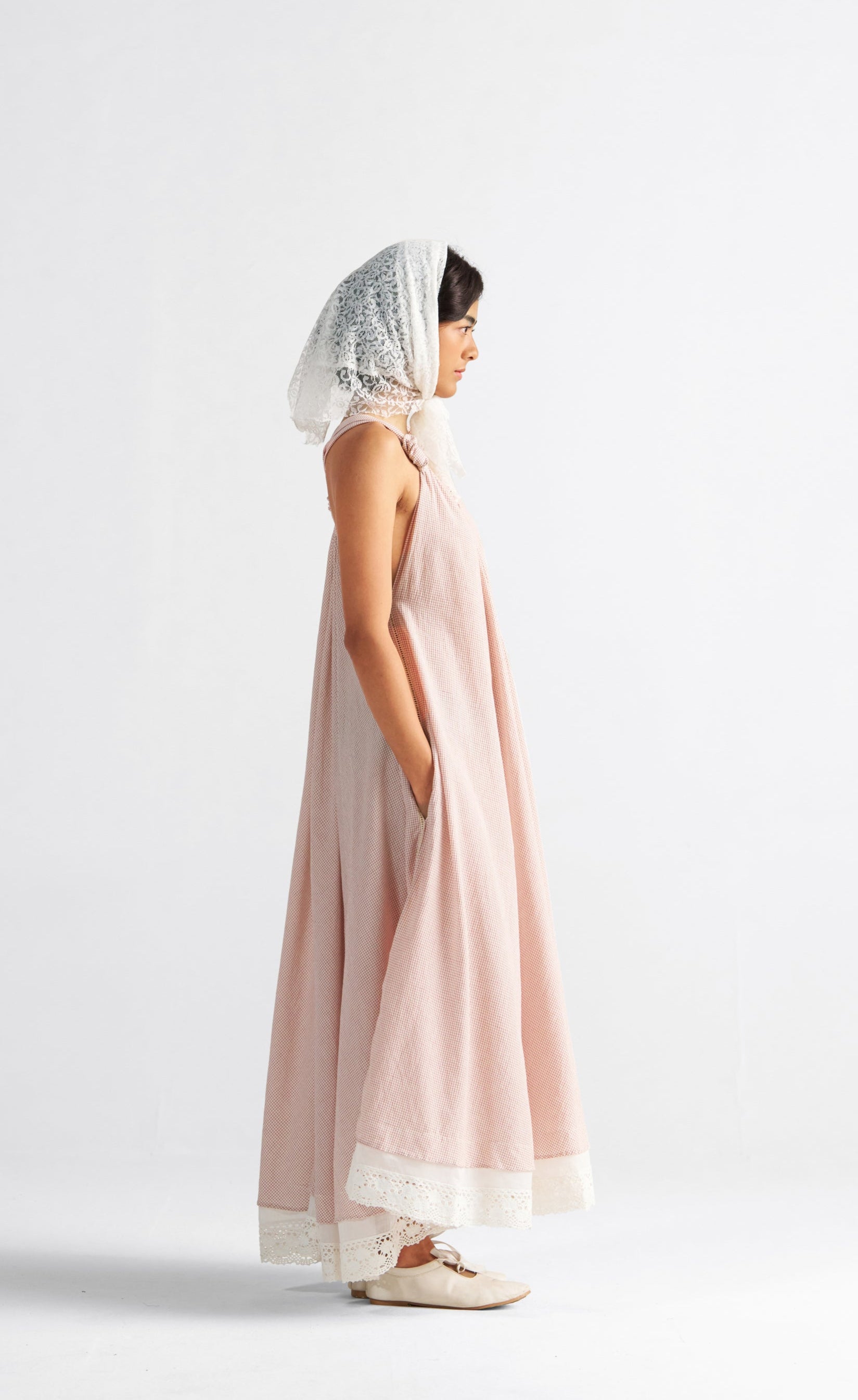 Handwoven in breathable cotton checks and cut on the bias, this backless summer dress flows with you. It features a soft knot at the neckline, cross-back straps, practical pockets, and delicate lace detailing at the hem. Madeline is your go-to for sunlit afternoons, slow gatherings, or just feeling beautifully yourself.